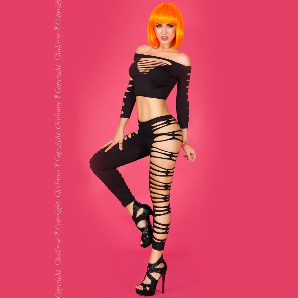 Sensual conjunto de duas peças, que vai fazer com que fique ainda mais desejada. O top é caracterizado pela generosa abertura no decote e nas costas, mas também pelas suas mangas ¾ com vários cortes. Também inclui um par de leggings a combinar, abertas nas laterais. É um produto de alta qualidade da Chilirose, apresentado numa elegante caixa.